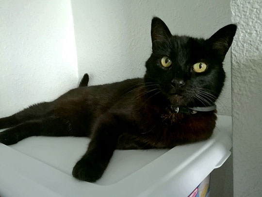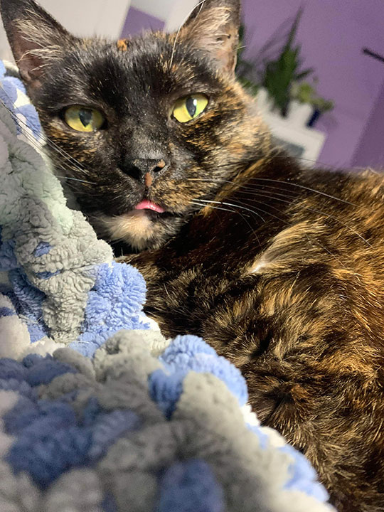 This is Lexy, she is 17 years old, and will be 18 in June. Lexy is owned by one of our assistants, Shae, and is from her sister’s cat’s litter. She is also called Toothless because she has nearly the same personality as the dragon from How to Train Your Dragon. Even being an old kitty, she has not slowed down in her hunting or her playtime. However, in her old age, she has become more of a love bug as compared to her spicy younger self.